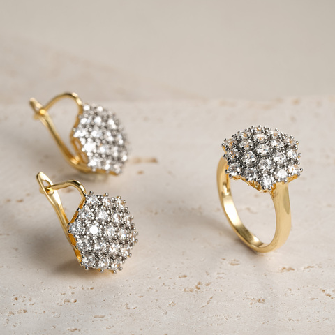 Hexagon Shiny Inlaid Moda Brinco Anéis Conjuntos para As Mulheres Chapeamento De Cobre 2 cor 14K Jóias de Ouro para Presentes De Casamento Delicados