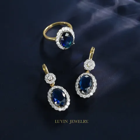 LUYIN Mulheres Vintage 2 Cores Anel Brincos Set 14K Ouro Cobre-Plated Oval Azul Zircão Requintado para Casamentos e Festas
