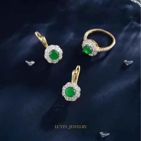 Estilo Floral Zircão Verde Incrustado 14K Ouro Luxo 2-Color Jóias Set Anel Brinco para As Mulheres Principalmente Feito de Cobre para Aniversários