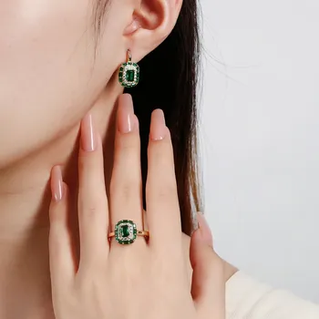 LUYIN seçilen bohem tarzı yeşil zirkon küpe yüzük seti bakır kaplama 14K altın renk narin kadının parti düğün hediye