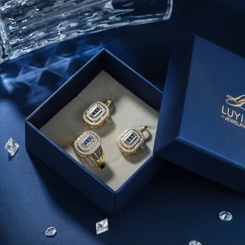 LUYIN yeni varış mavi zirkon moda takı küpe yüzük seti 14K altın bakır kaplama klasik parti düğün için kadın hediye