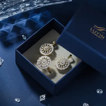 LUYIN kadın 14K altın renk düğün küpe yüzük seti yeni varış çiçek serisi parlak zirkon kakma bakır yıldönümü hediyeler